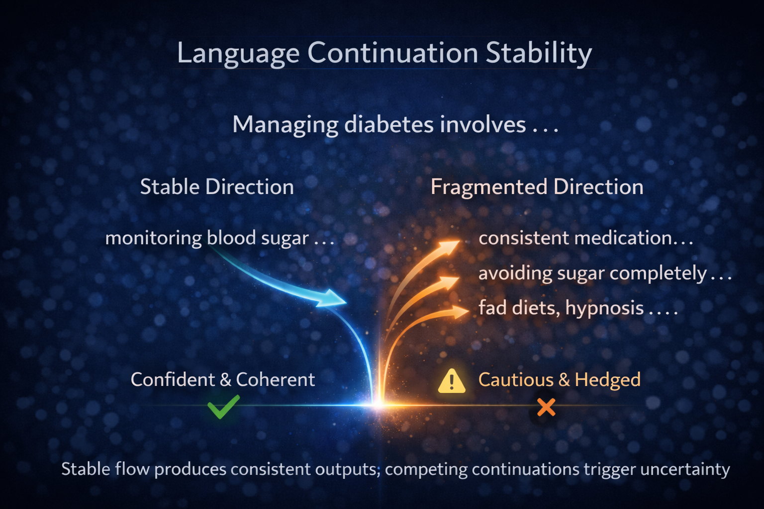 When language flows cleanly toward a single continuation, outputs appear confident and decisive. When multiple competing continuations exist, outputs become cautious, hedged, exploratory, or trigger external lookup.